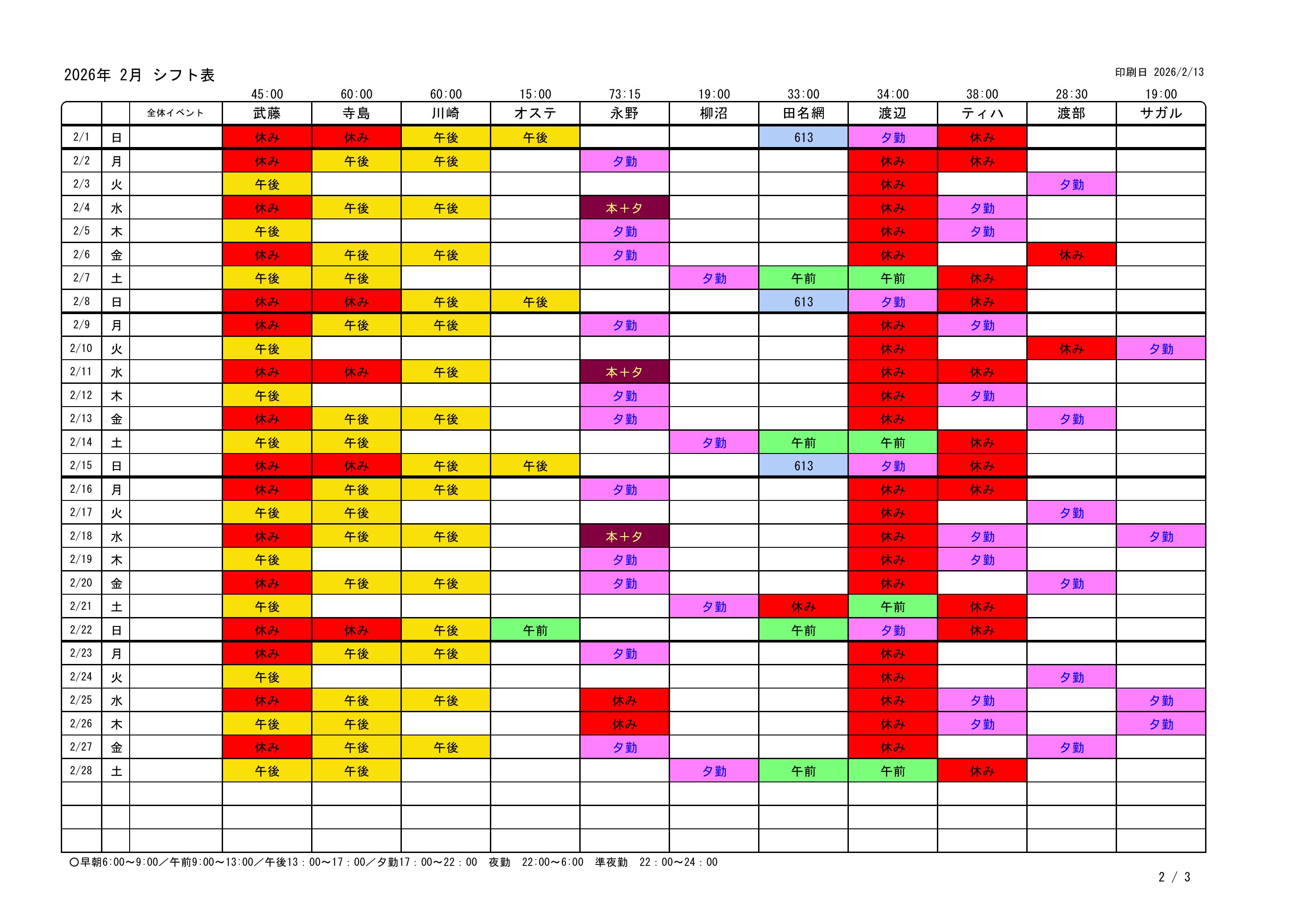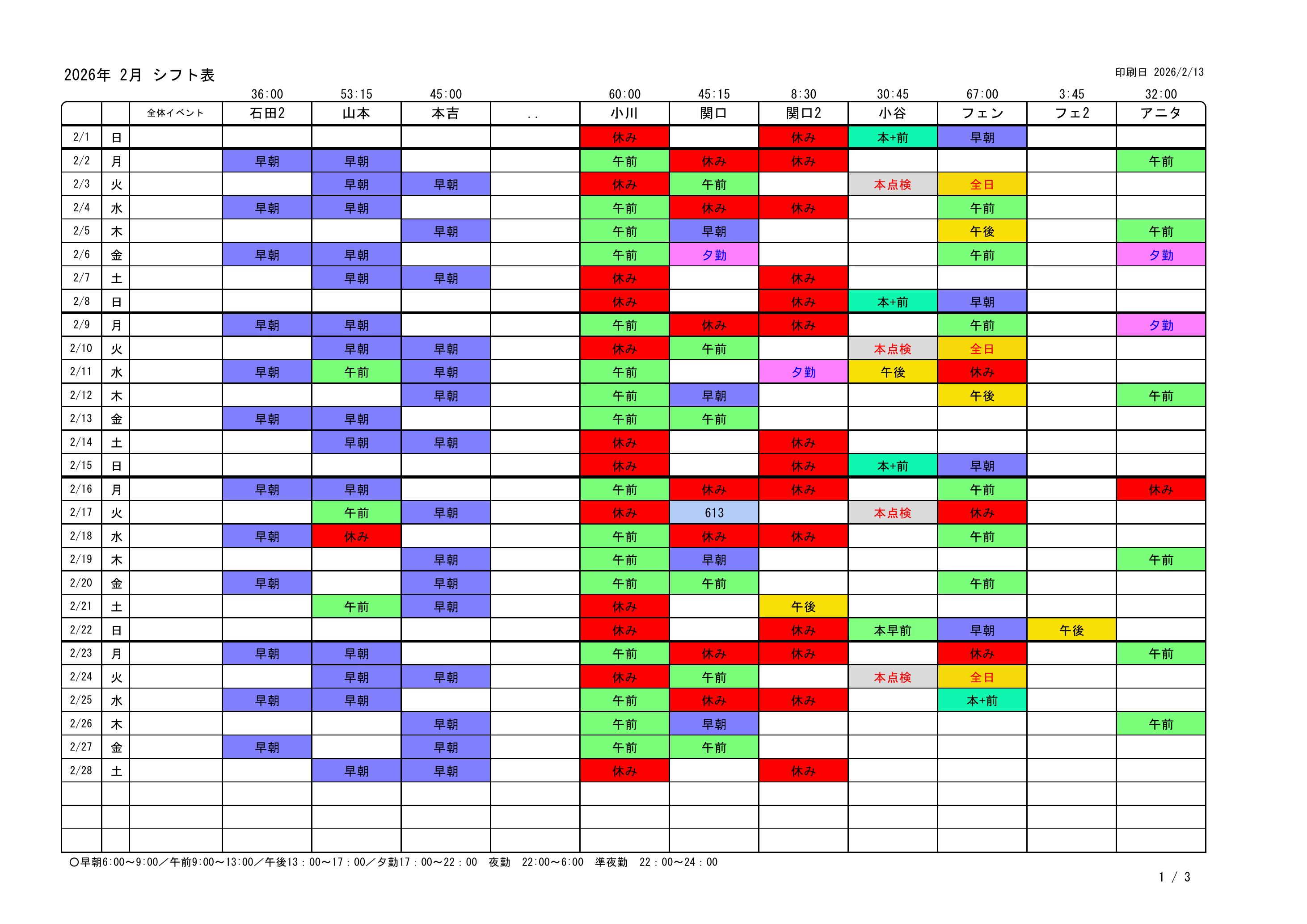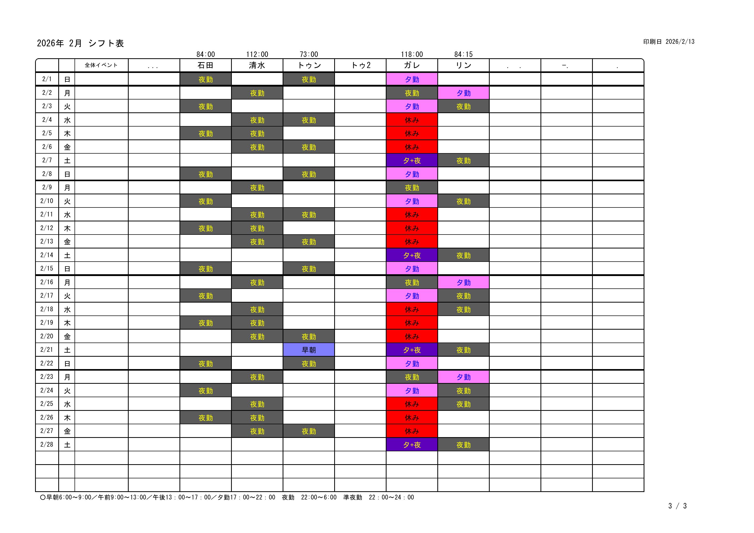| 各シフト時間帯で全員が同時に休みという事態は相談しあって避けて下さい。 |