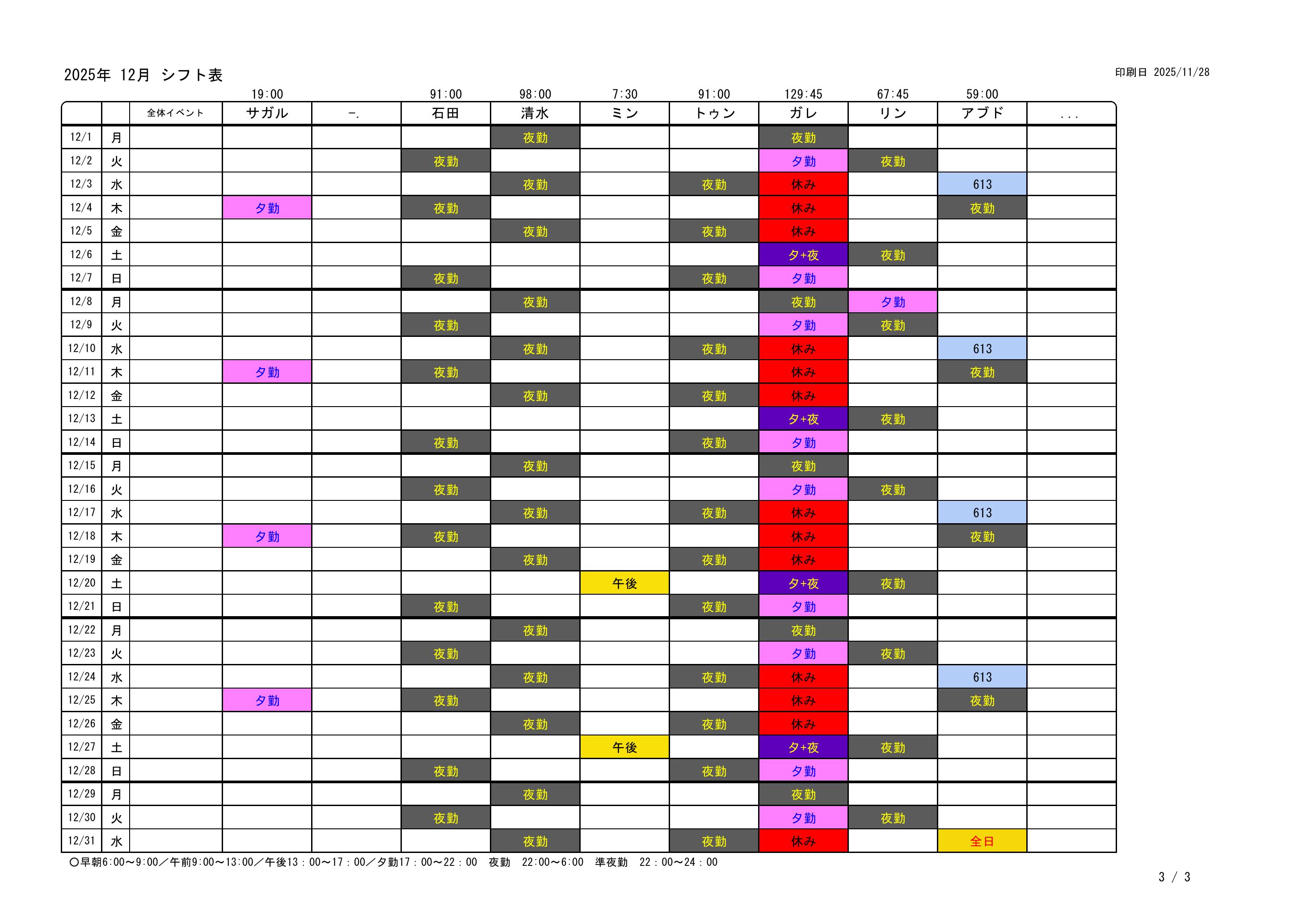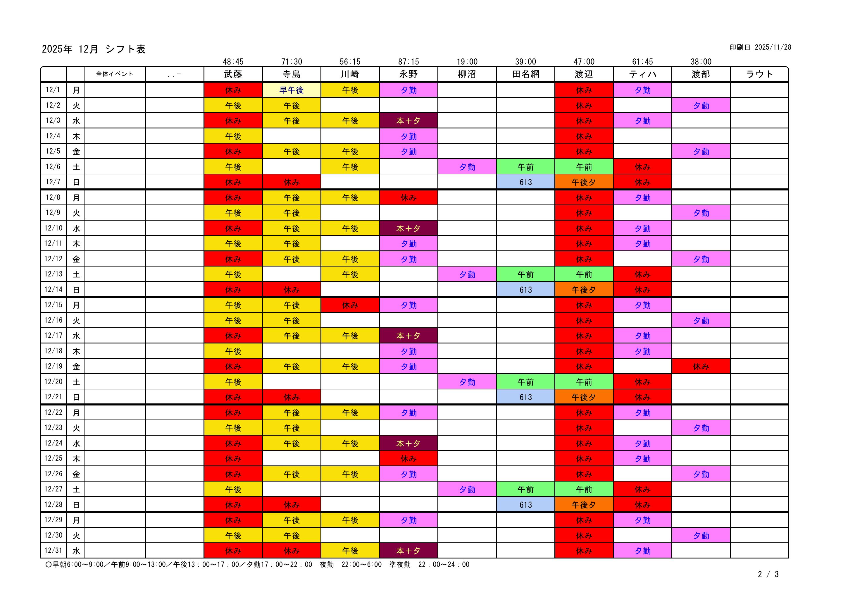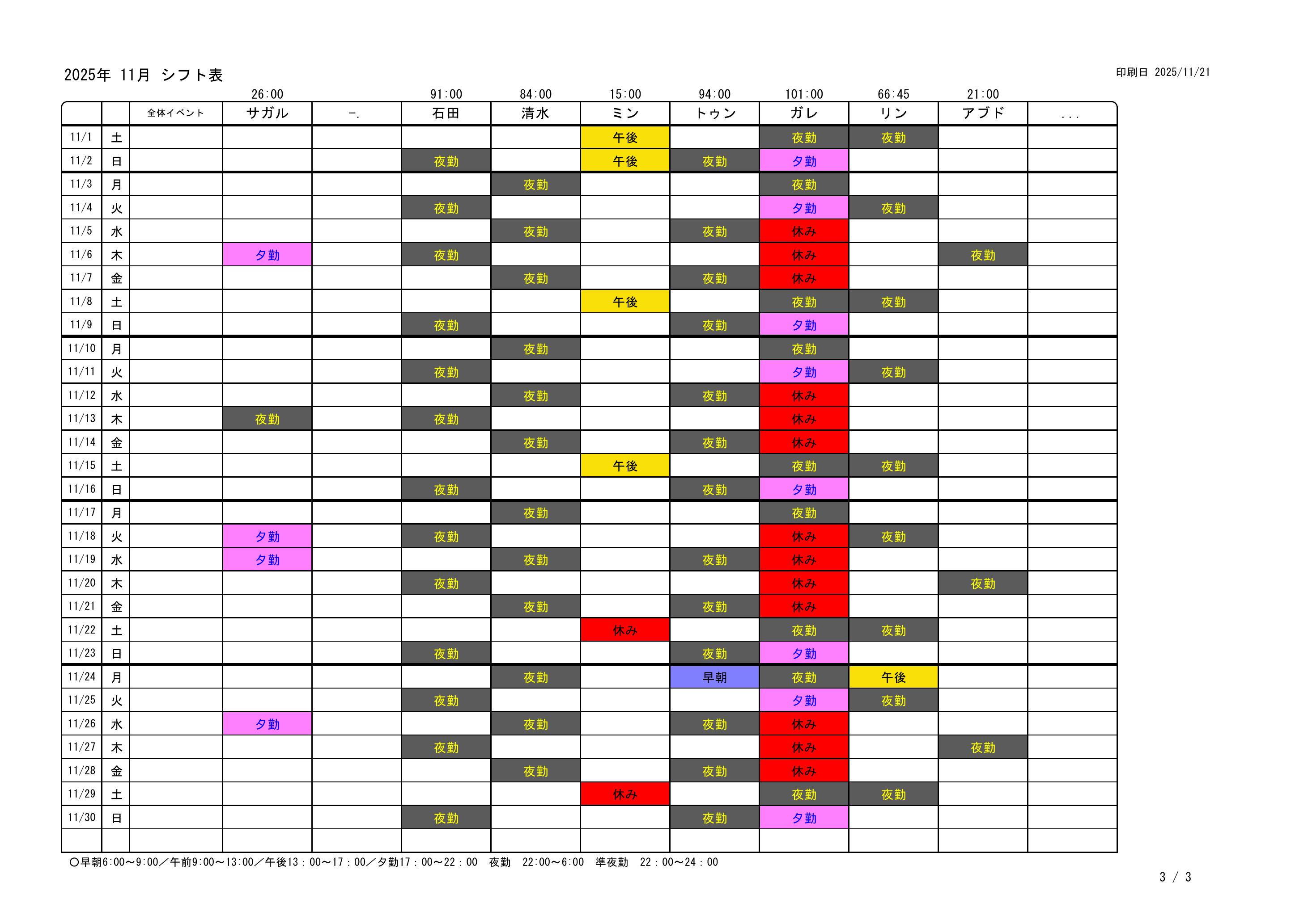 | 各シフト時間帯で全員が同時に休みという事態は相談しあって避けて下さい。 |