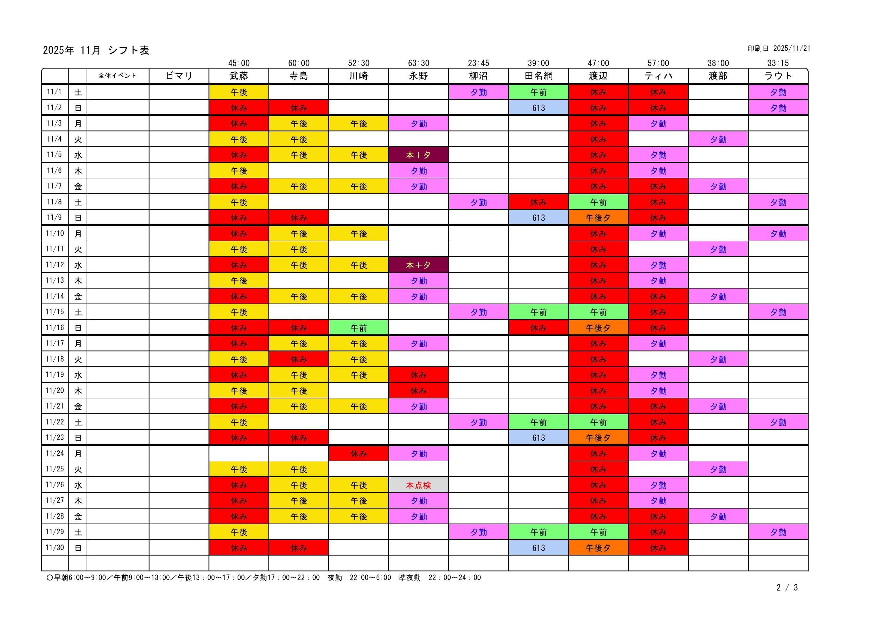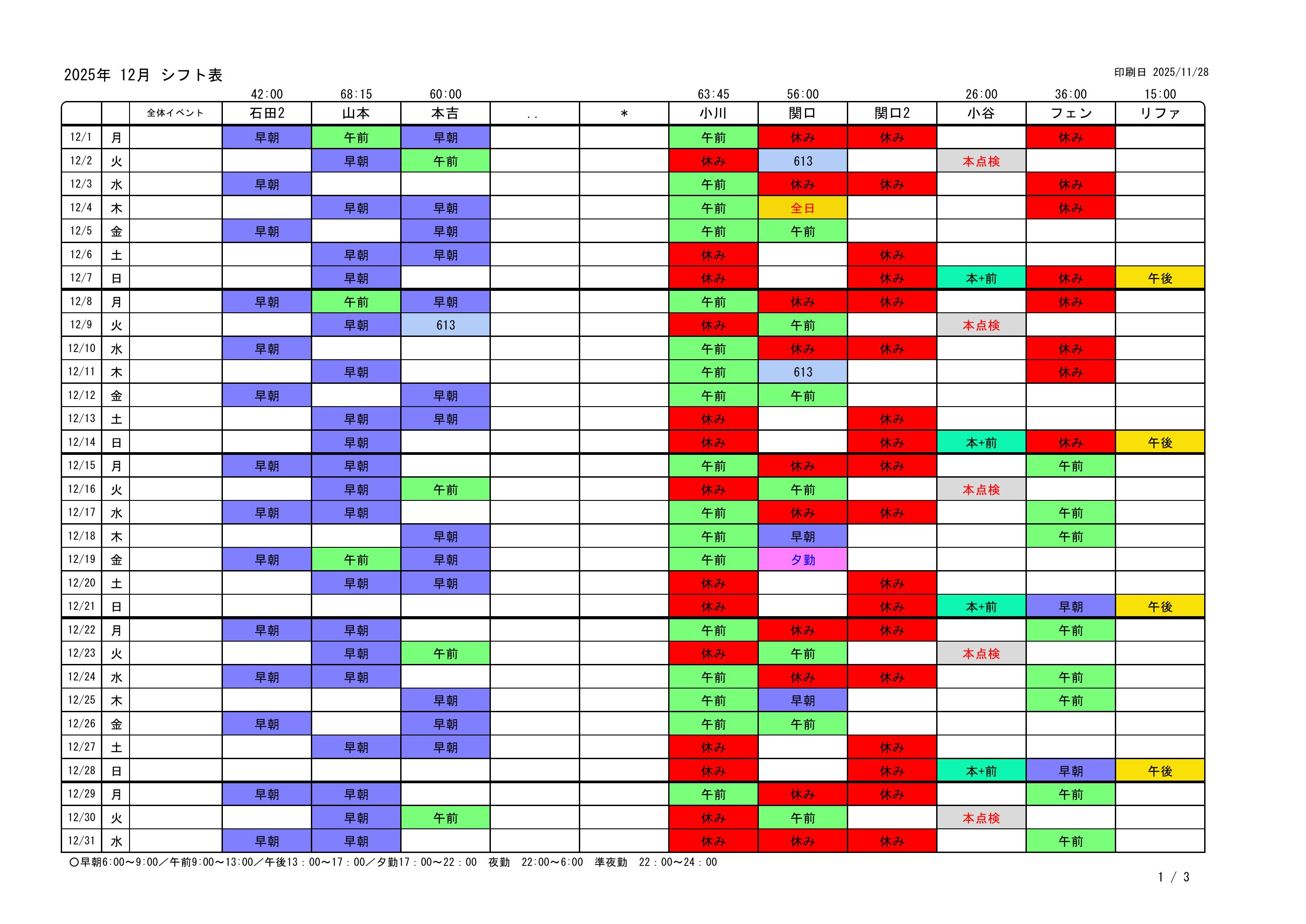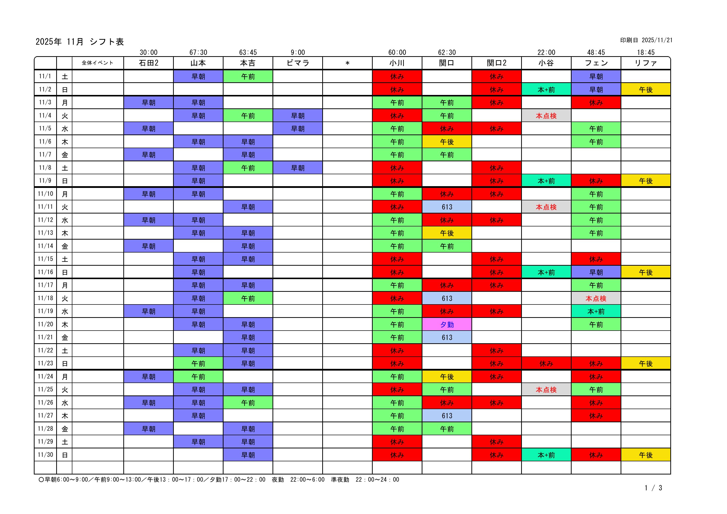 | 各シフト時間帯で全員が同時に休みという事態は相談しあって避けて下さい。 |