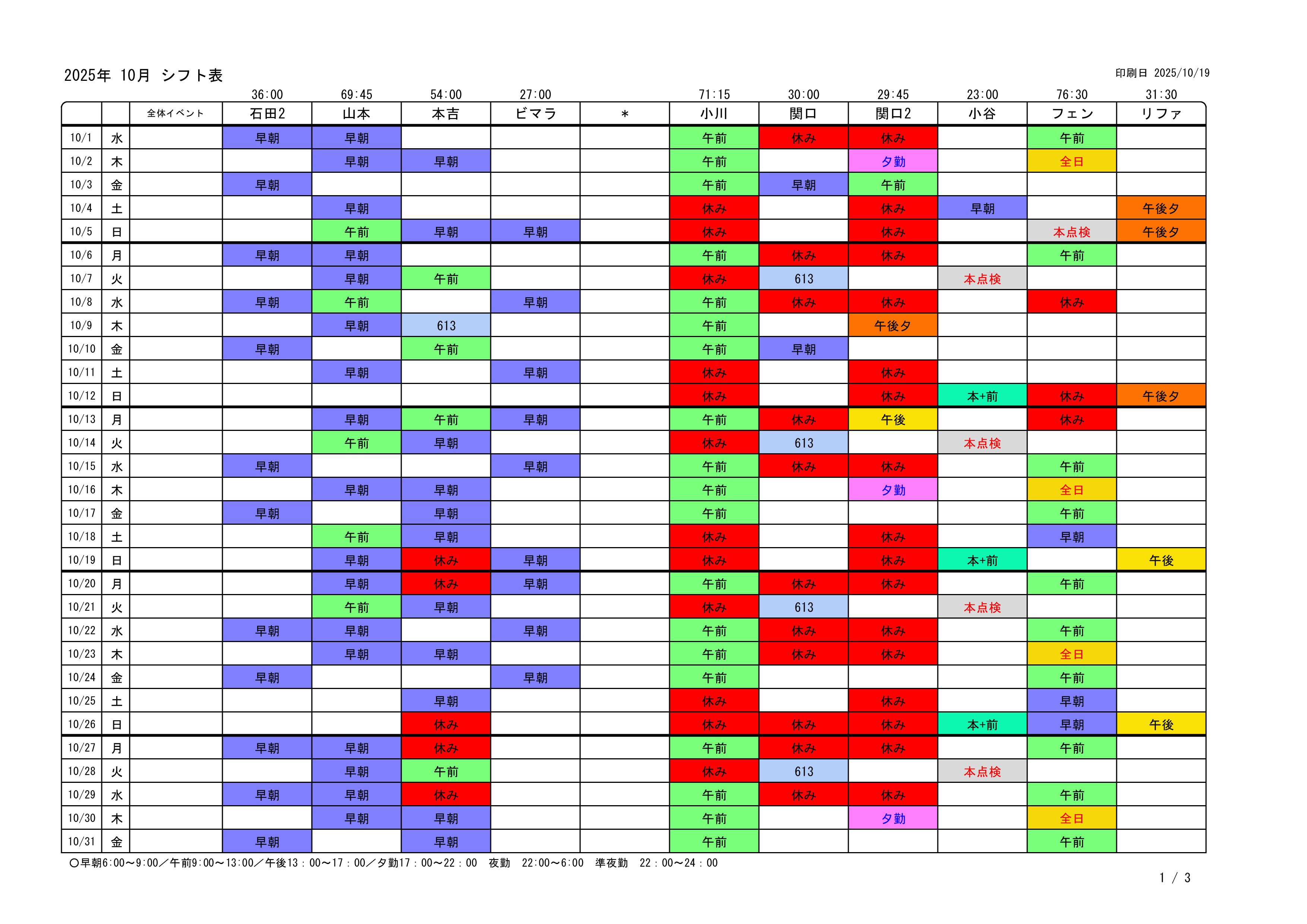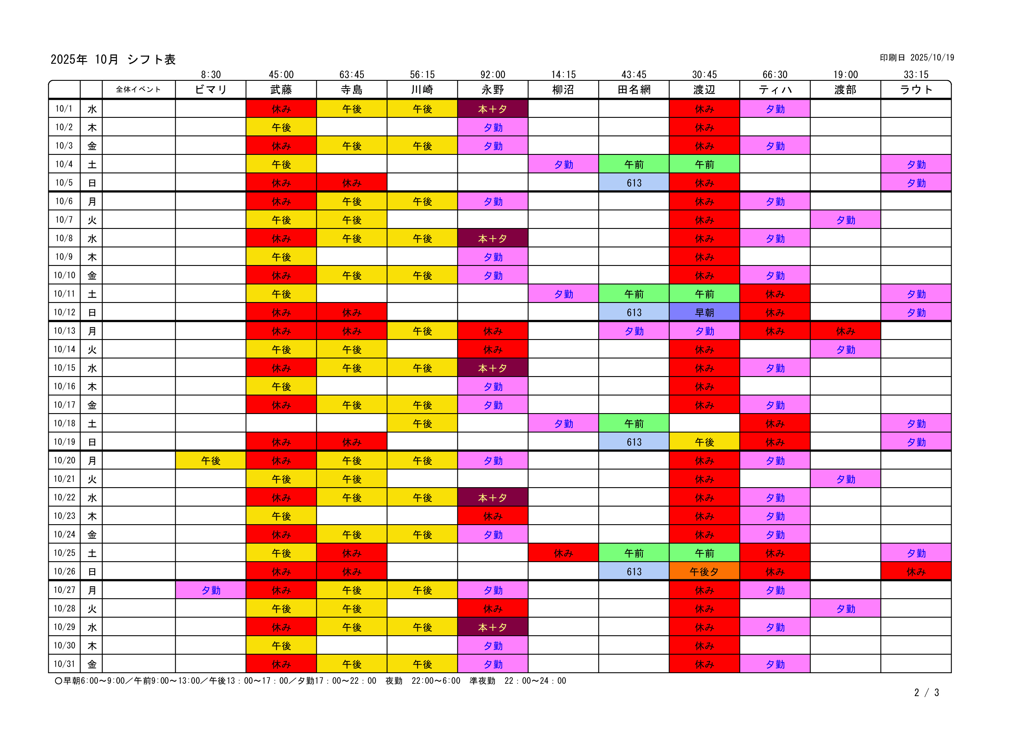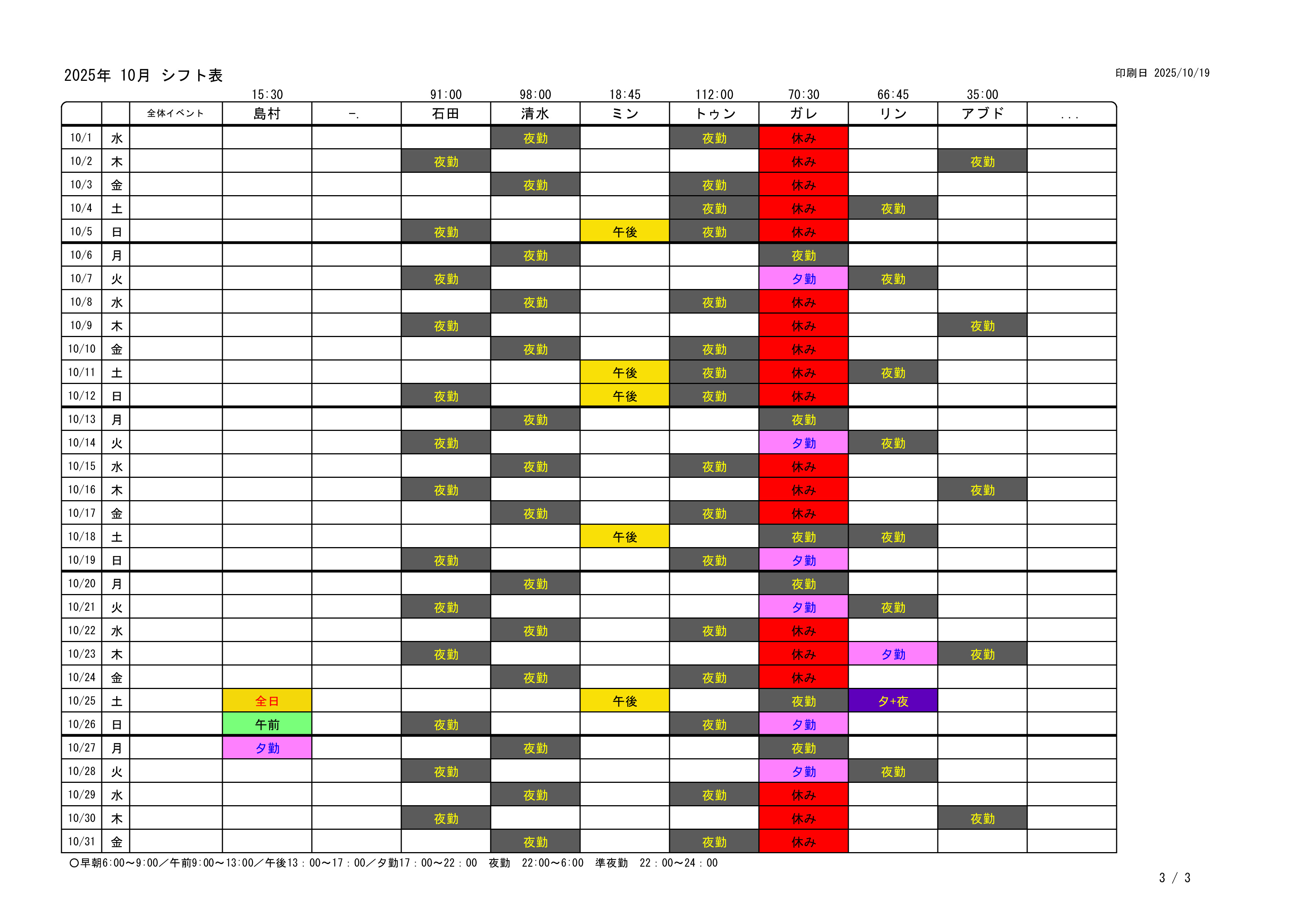 各シフト時間帯で全員が同時に休みという事態は相談しあって避けて下さい。 |